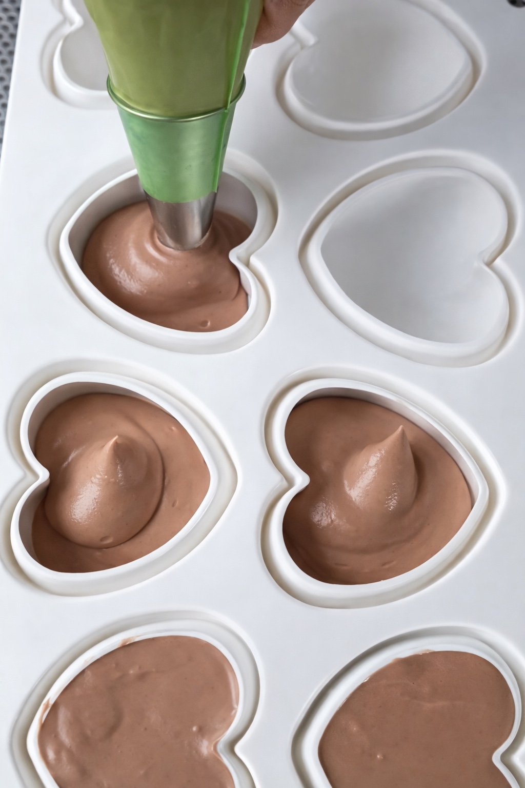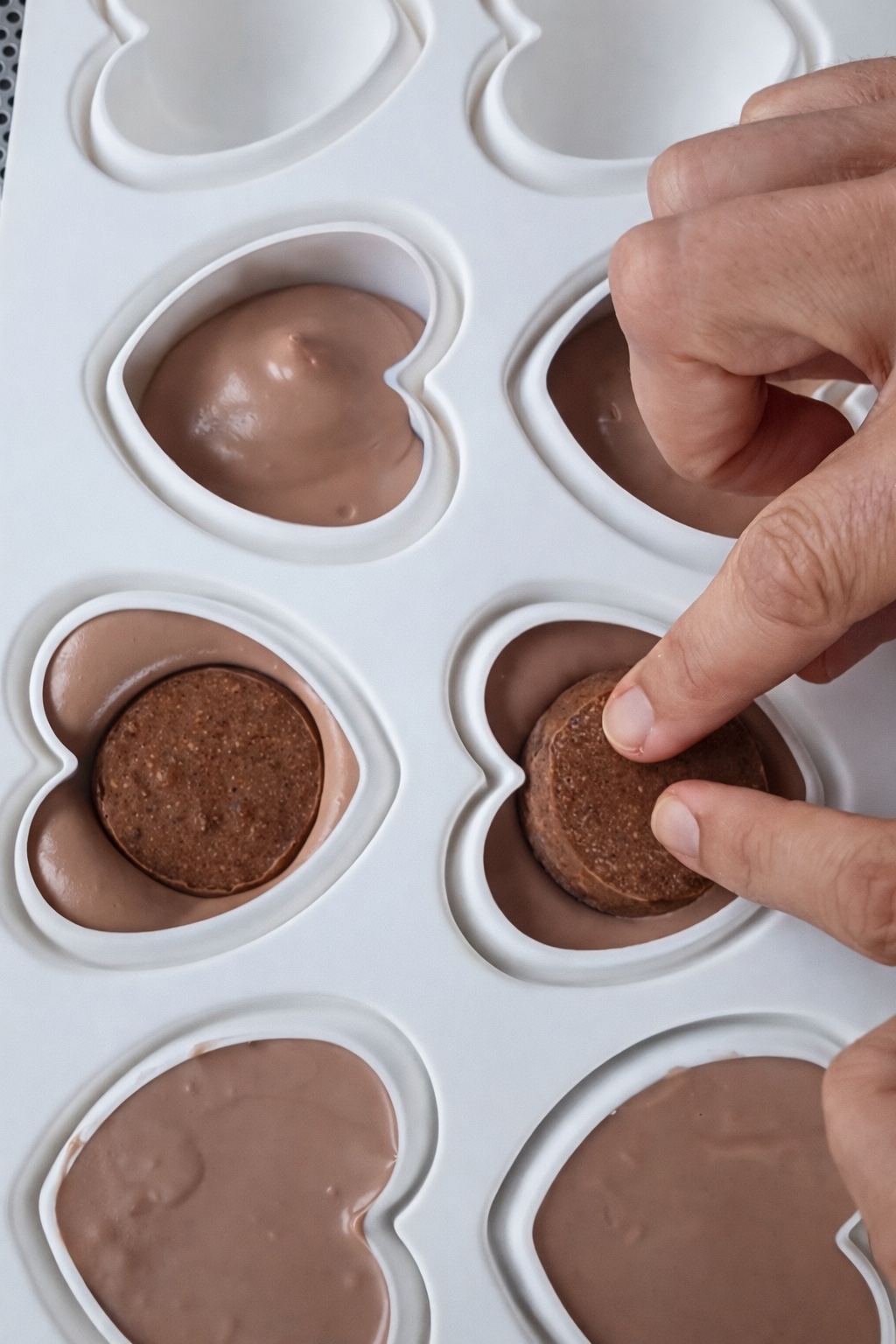 Verter en cada cavidad del molde de corazones, colocar el inserto que realizamos previamente y completar con más mousse.