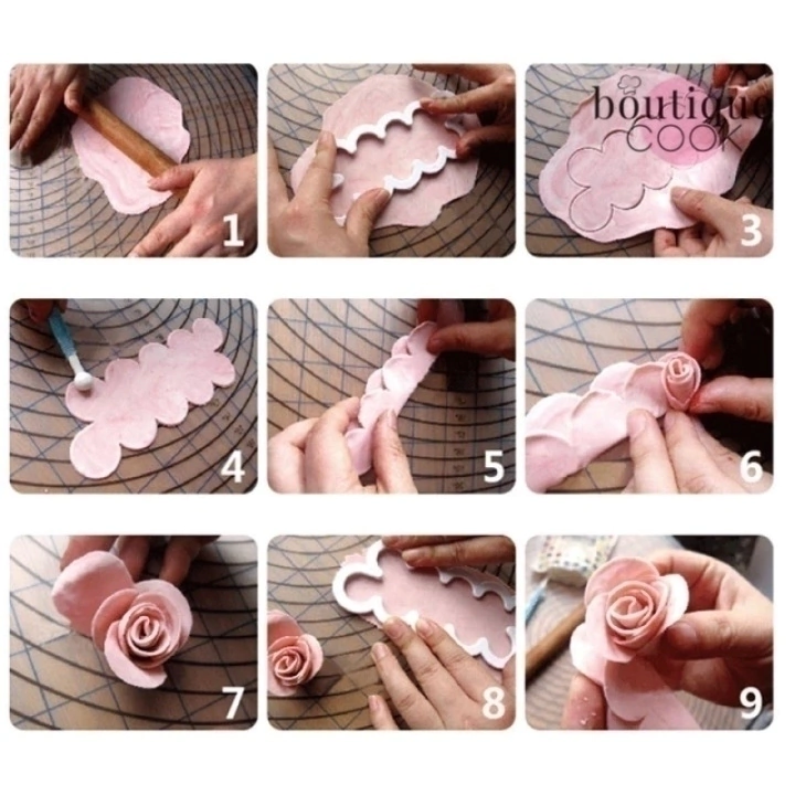 Modo de uso: cortar el fondant y utilizar la parte posterior de un rodillo para suavizar los bordes. Cubrir una mitad con pegamento comestible y pegarla con la otra. Colocar en la mano la pieza de fondant y doblar con cuidado las hojas. Para hacer rosas más pequeñas, cortar en piezas más pequeñas y utilizar el mismo método que con la rosa grande.