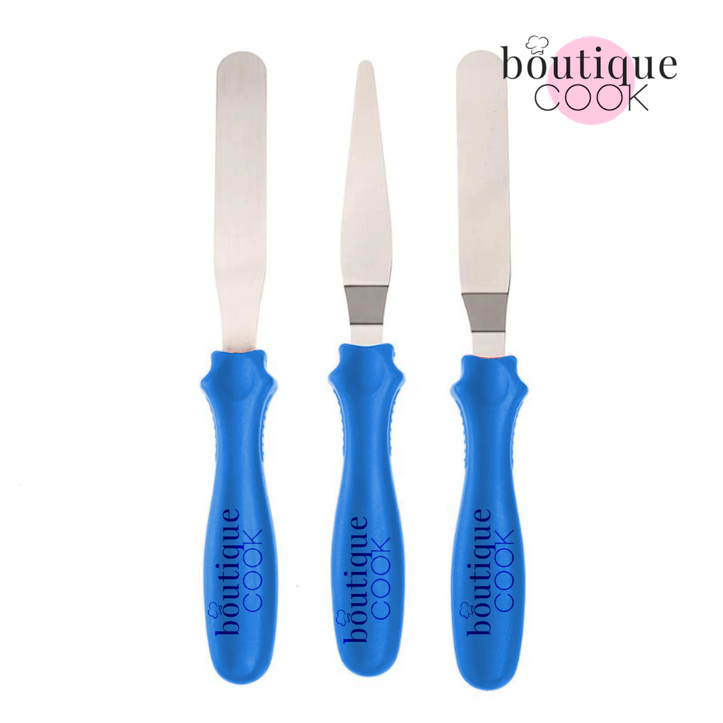 Set de 3 espátulas con mango plástico de colores y punta de acero inoxidable, de distintas terminaciones. Sus terminaciones finas y precisas son perfectas para conseguir un gran control sobre glaseado, frosting y crema. Tienen un mango diseñado para ofrecer comodidad y confort, ideal para acceder a las zonas más pequeñas.