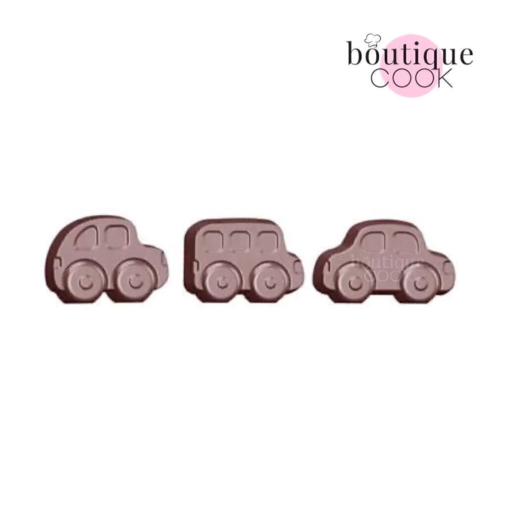 Molde profesional de cavidades para elaborar bombones de chocolate en forma de medios de transporte terrestres.