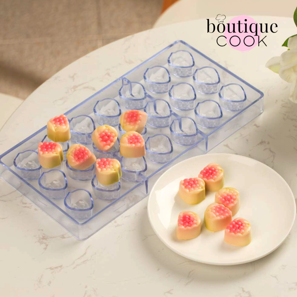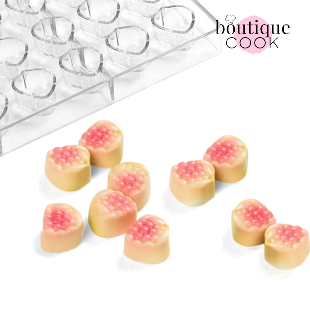 El policarbonato es un termoplástico que ofrece numerosas ventajas para su uso en la chocolatería. Es un material rígido, resistente y duradero. Presenta un grado extraordinario de transparencia, lo que facilita observar si el chocolate en su interior ya se ha contraído y así poder proceder a desmoldar de forma segura. El brillo que se obtiene en los chocolates es muy superior a comparación de otros materiales, como la silicona o el plástico. Los moldes mantienen su forma a pesar del calor y uso prolongado. Además, distribuyen el calor del chocolate atemperado más uniformemente y reducen las posibilidades de que se formen manchas mates en los bombones debido a la refrigeración.
