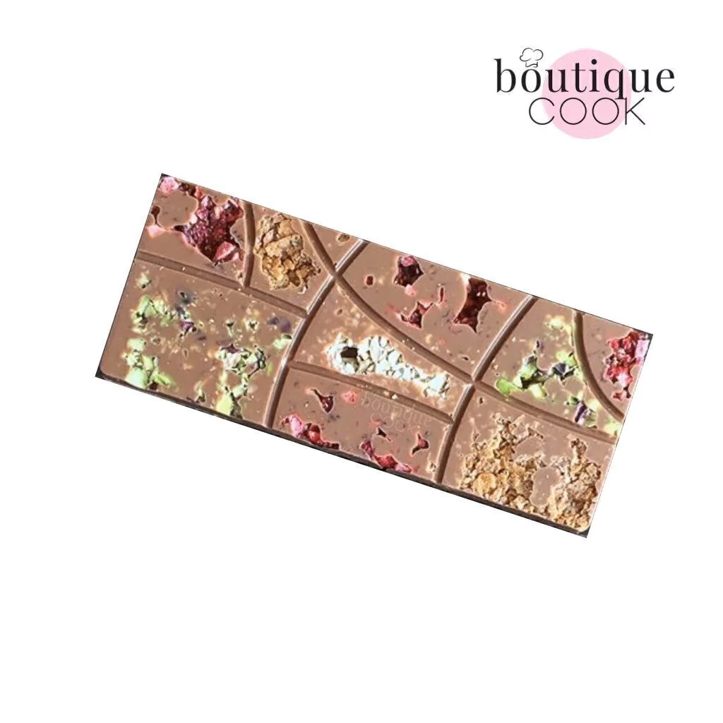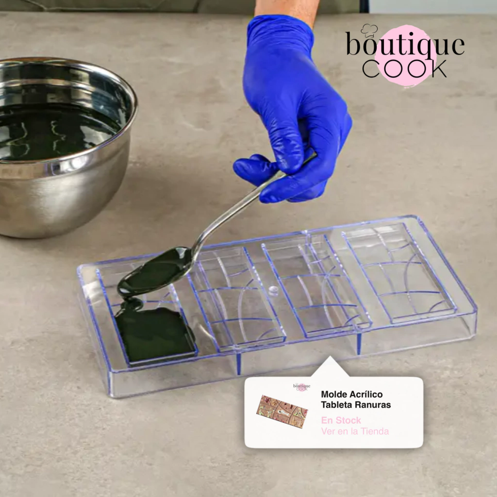 Molde profesional de 4 cavidades para elaborar tabletas de chocolate con efecto de línas curvas.