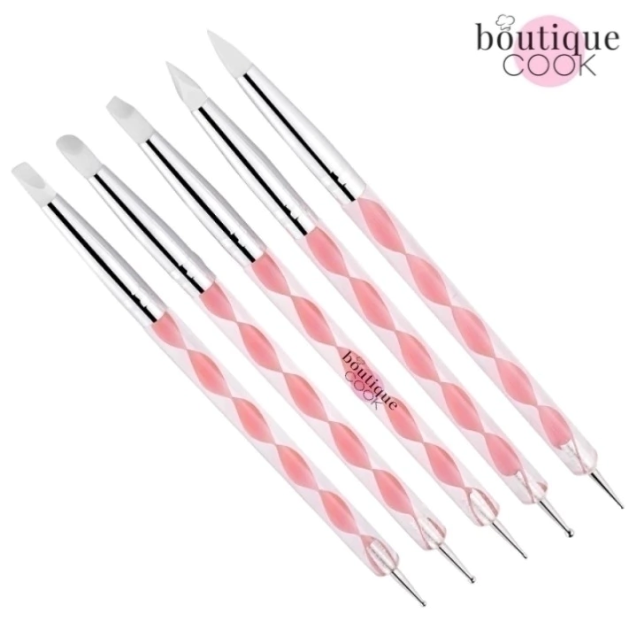 Set de 5 pinceles , ideales para decorar y modelar sobre pasta de azúcar. Son perfectos para decorar fácilmente sobre fondant, mazapán, pasta de goma... en tortas, cupcakes, galletas, pequeñas figuras, porcelana y artesanias. Con punta de silicona de excelente calidad. Incluye 5 modelos diferentes.