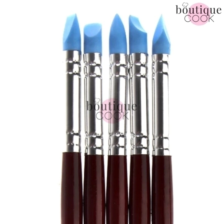 Set de 5 pinceles con puntas de silicona, ideales para decorar y modelar sobre pasta de azúcar. Son perfectos para decorar fácilmente sobre fondant, mazapán, pasta de goma... en tortas, cupcakes, galletas, pequeñas figuras, porcelana y artesanias. Con punta de silicona de excelente calidad. Incluye 5 modelos diferentes.